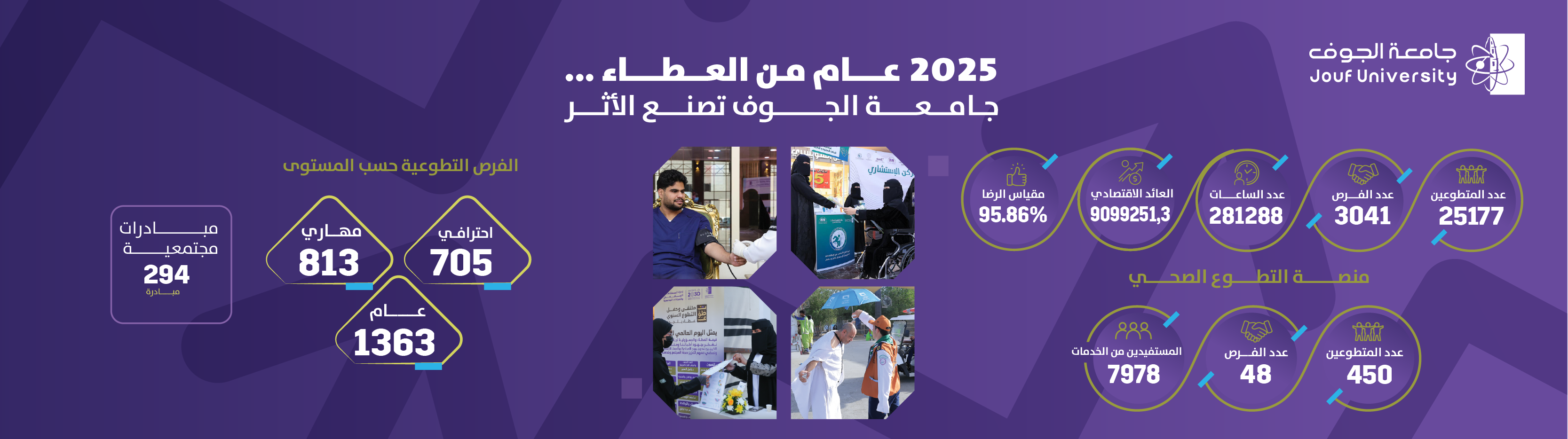 Jouf University places great importance on developing its social responsibility and volunteering system and strengthening the culture of giving among its community members. This is achieved by establishing governing policies and frameworks, enabling colleges and supporting departments to design sustainable initiatives that meet regional needs and align with the priorities of Saudi Vision 2030. The university organizes institutional volunteering through volunteer registration, task assignment, monitoring, and recognition. It also builds effective partnerships with the public, private, and nonprofit sectors and provides training programs to develop volunteers’ skills. Academic and research expertise is used to serve society and continuously measure and improve the social impact of initiatives, enhancing participation by students and staff while supporting local development and quality of life.